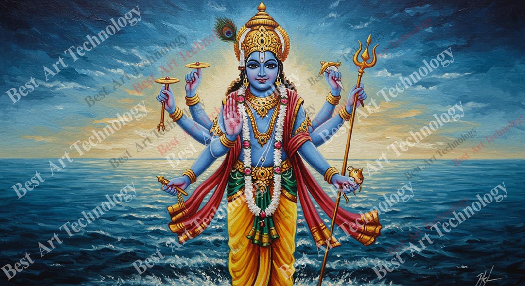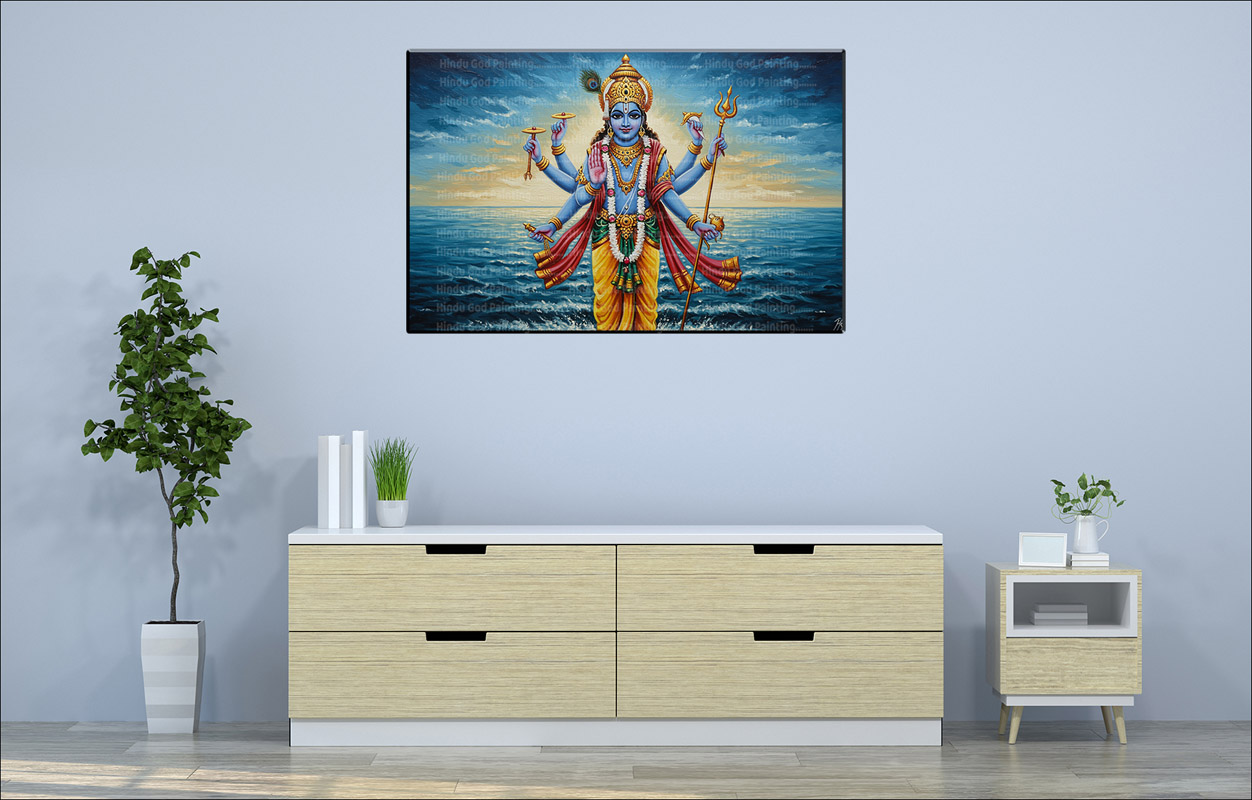 - High-Resolution Print: Captures the serene image of Lord Vishnu standing in the ocean, holding his symbols, under a vibrant sunrise or sunset sky.