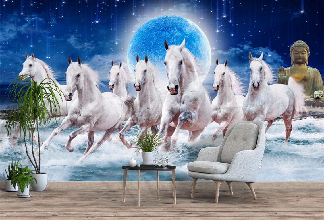 - Premium Quality Mural: High-resolution artistic design featuring white horses, a moon, and a Buddha statue.