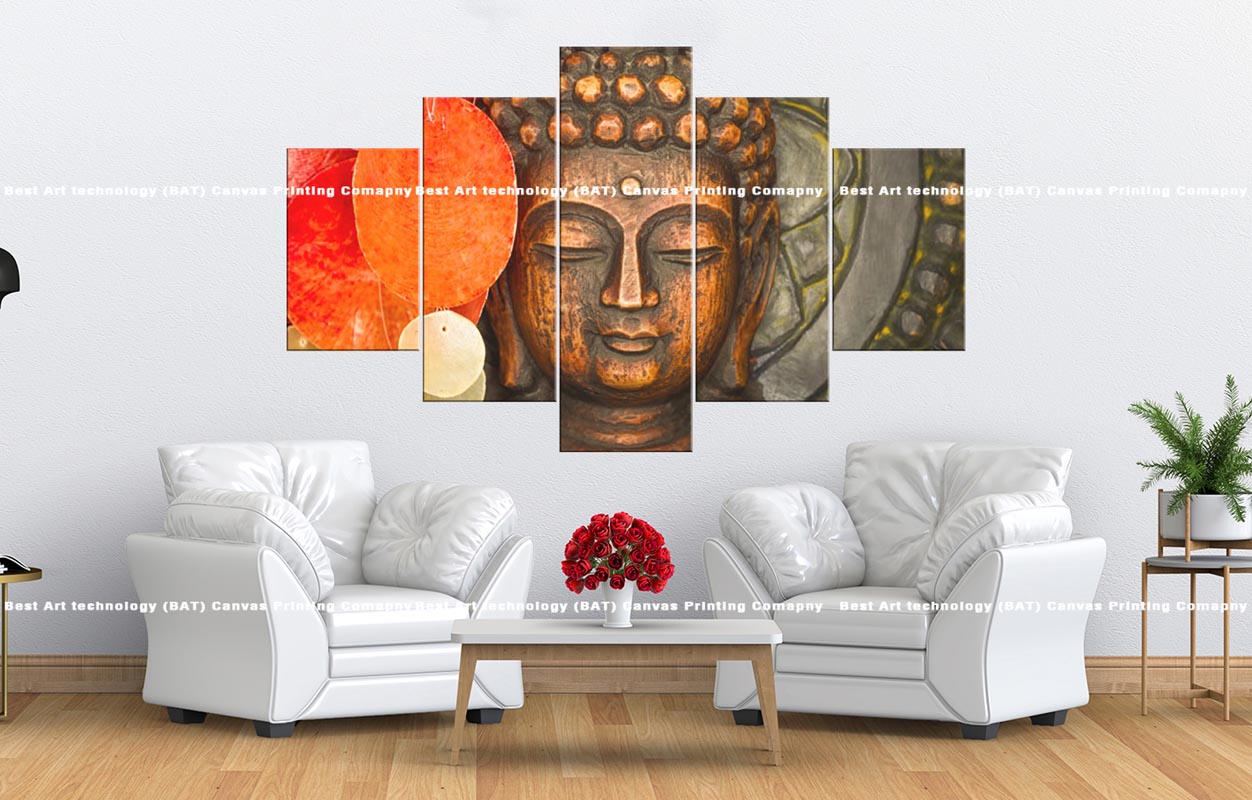 Bring a sense of calm and the cozy beauty of autumn to your space with this tranquil multi-panel canvas print. The artwork features a serene Buddha face with a warm wooden texture, accented by vibrant autumn leaves in shades of red, orange, and yellow, all spread across five panels. This Wooden Buddha Autumn Leaves Canvas will infuse your home with a peaceful and inviting atmosphere.